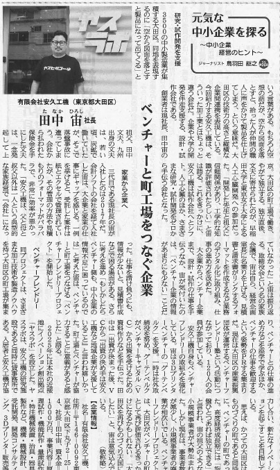 記事では安久工機の歴史や、安久工機が発起人として立ち上げたベンチャーフレンドリープロジェクトについて、スタートアップ企業との共創を通じた新しいモノづくりの形について取り上げていただきました。