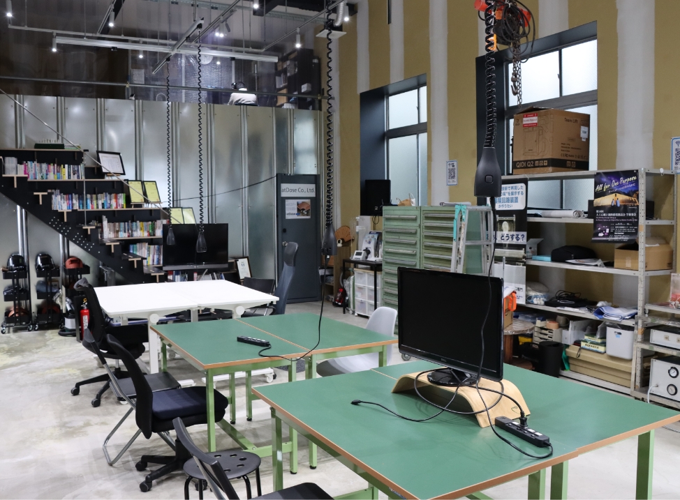 1Fファブスペースの一部と2F多目的スペースをコワーキングスペースとして共有。スタートアップの拠点としても利用可能。
