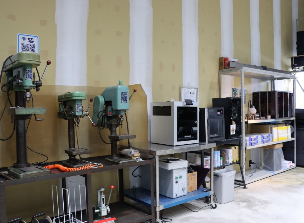 3Dプリンタやボール盤、各種工具など、高速試作に特化した加工設備を24時間利用可能。機械設備利用にかかる研修も提供。